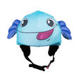 Universal-sized blue axolotl helmet cover with playful gills, made from flexible and durable material for skiing, biking, snowboarding, and for more fun.